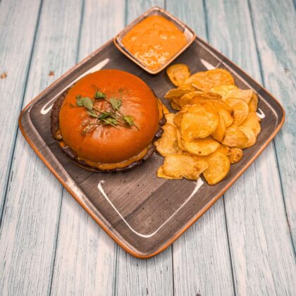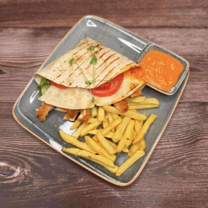 Rántott csirkés quesadilla, hasábburgonyával, ajvárral